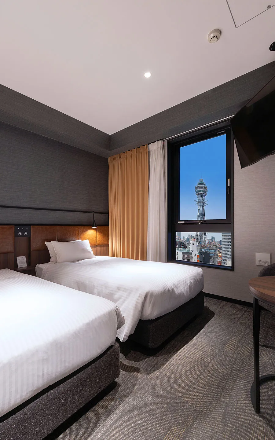 「日和ホテル大阪新世界」は、「新世界」エリアの中心に位置し、通天閣へ徒歩3分、周辺には串カツやたこ焼きなど大阪名物の飲食店が並び、なにわ情緒あふれる大阪下町カルチャーを存分に楽しめます。
