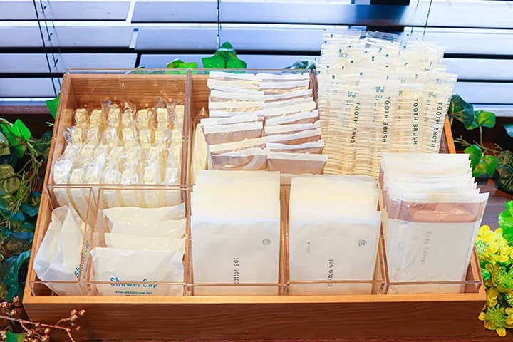 1階ロビーに設置しております。綿棒、コットン、ボディタオル、ヘアブラシ、ヘアゴム、カミソリ、ティーバッグなど、必要な分をお部屋へお持ちください。